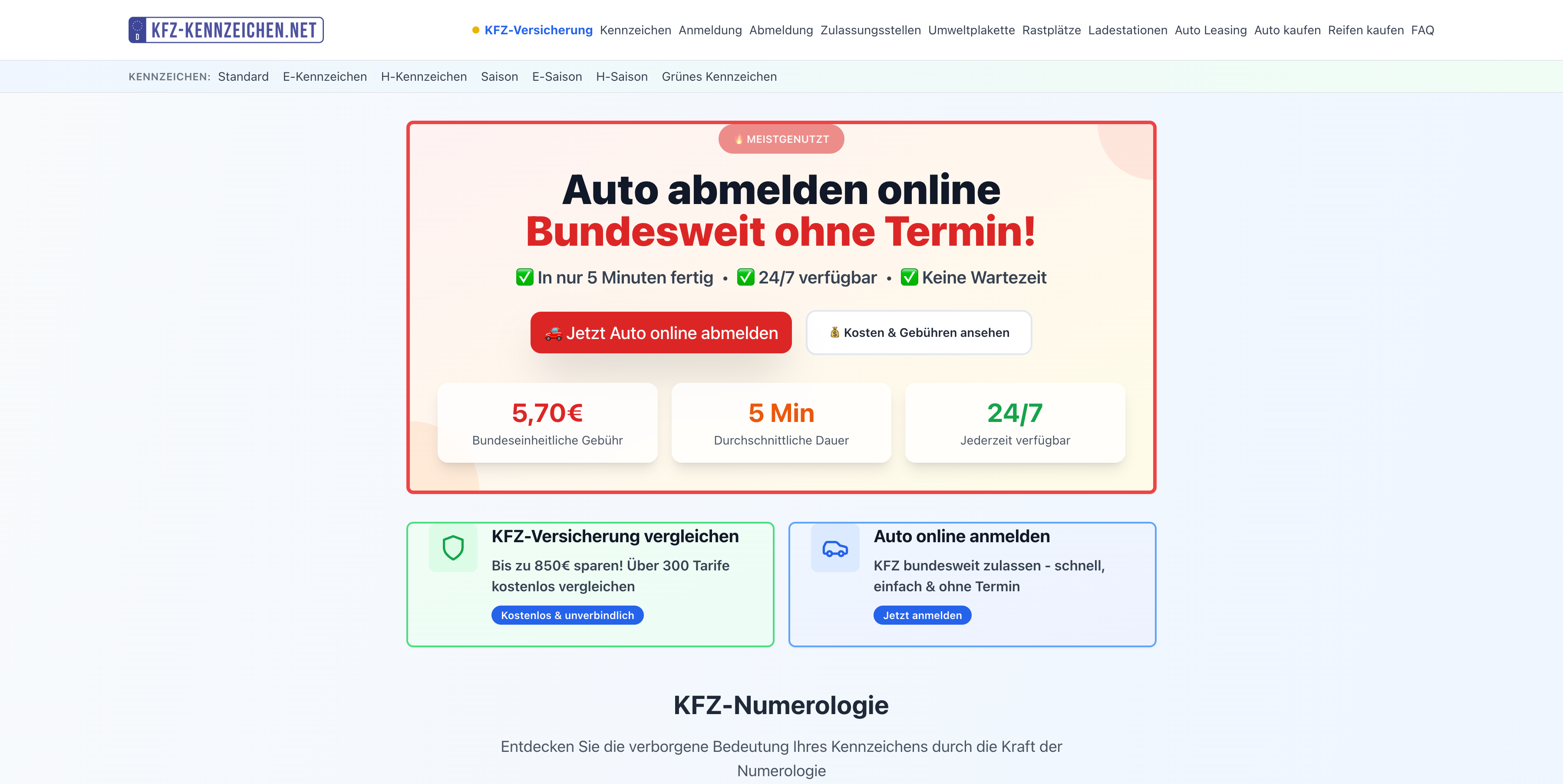 KFZ-Kennzeichen.net ist eine umfassende React-basierte Plattform, die alle Services rund um Kraftfahrzeug-Zulassungen in Deutschland digital abbildet. Von der Online-Abmeldung über Wunschkennzeichen-Reservierung bis hin zum integrierten Leasing-Marktplatz - die Website vereint sämtliche KFZ-relevanten Dienstleistungen unter einem Dach.