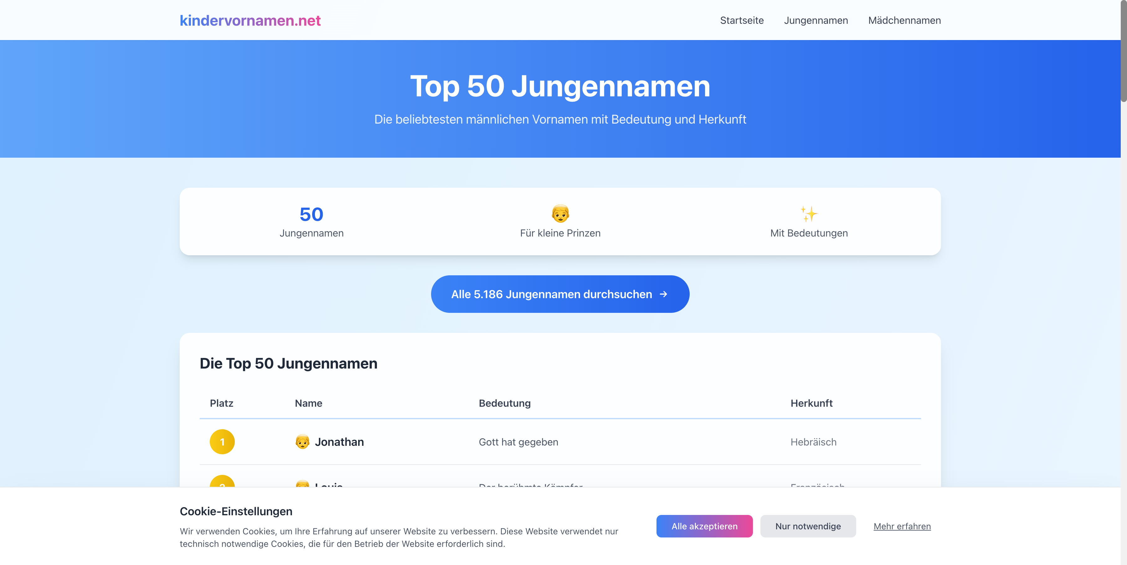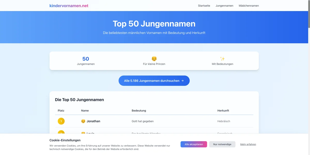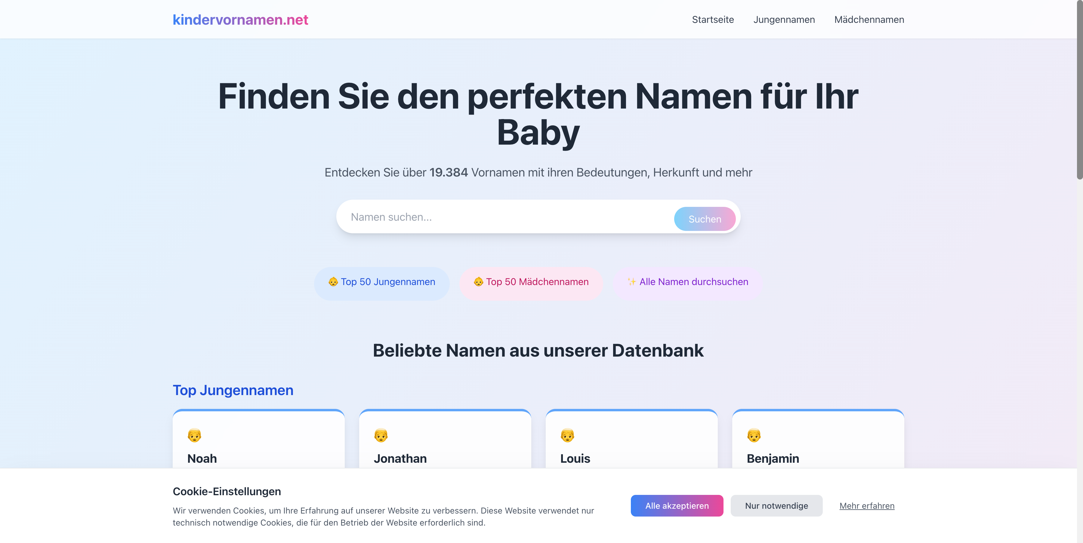 Kindervornamen.net ist eine moderne React-Plattform, die werdenden Eltern bei der Suche nach dem perfekten Babynamen unterstützt. Mit einer umfassenden Datenbank von über 19.000 Vornamen, intelligenten Suchfunktionen und aktuellen Trendanalysen bietet die Website eine professionelle Lösung für die Namenswahl.