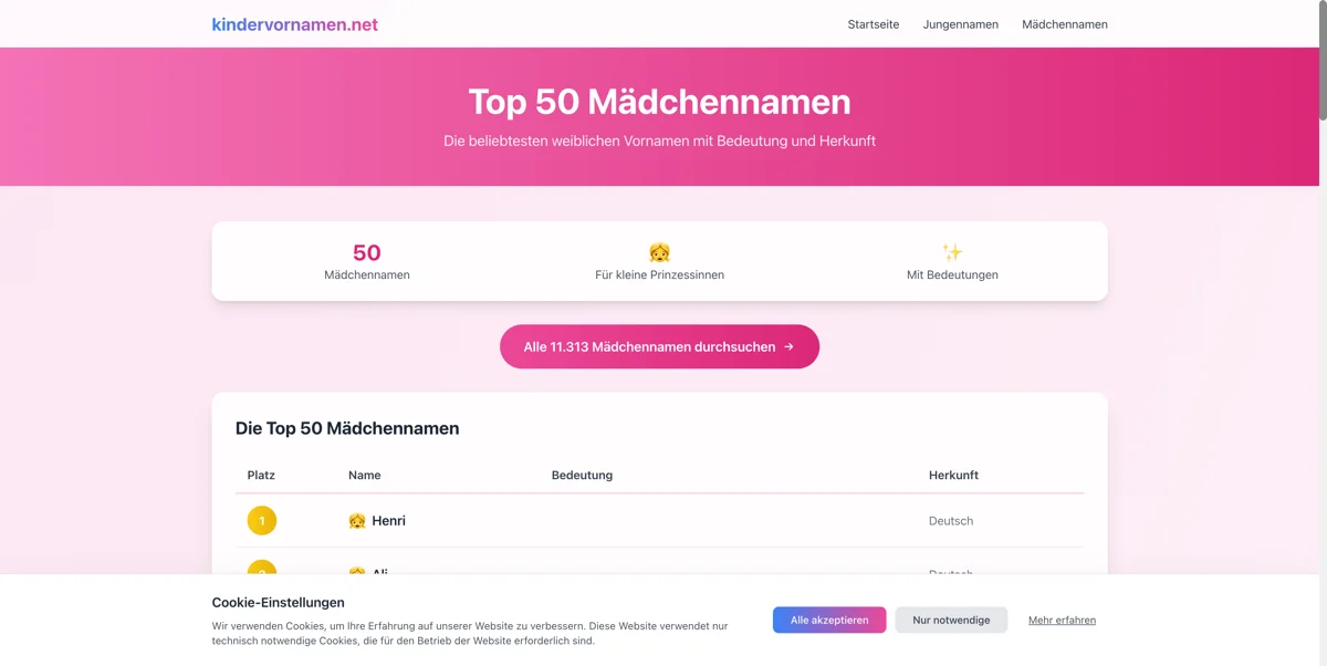 Kunde: Meng GmbH Jahr: 2024 Framework: React / Next.js URL: https://kindervornamen.net/