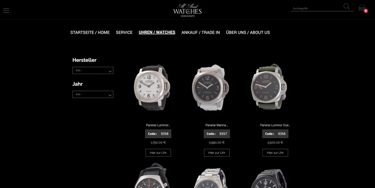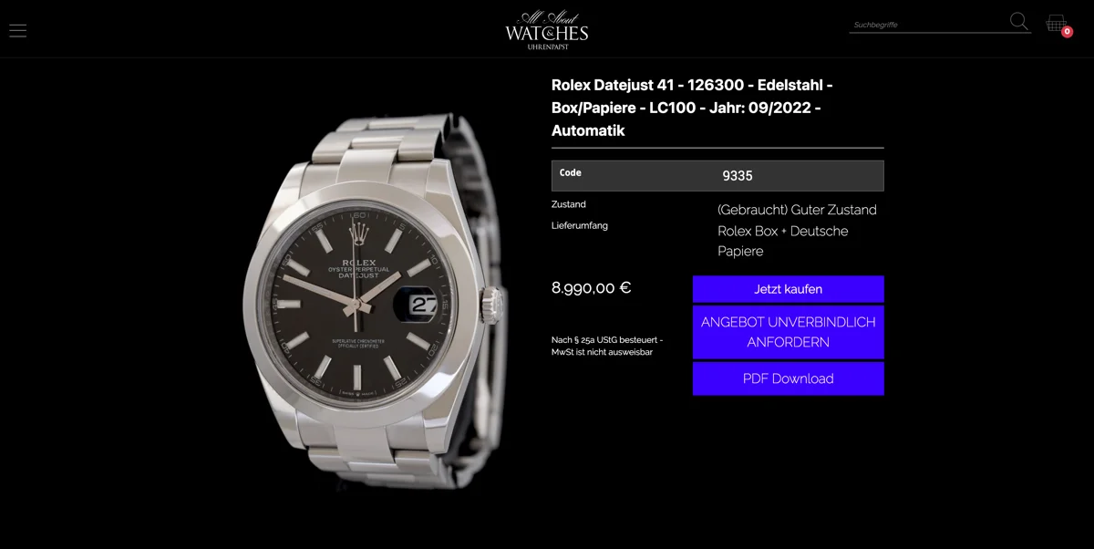 Kunde: Uhrenhändler Frankfurt Jahr: 2024 Framework: Drupal 11 mit Drupal Commerce URL: https://allaboutwatches.de/de